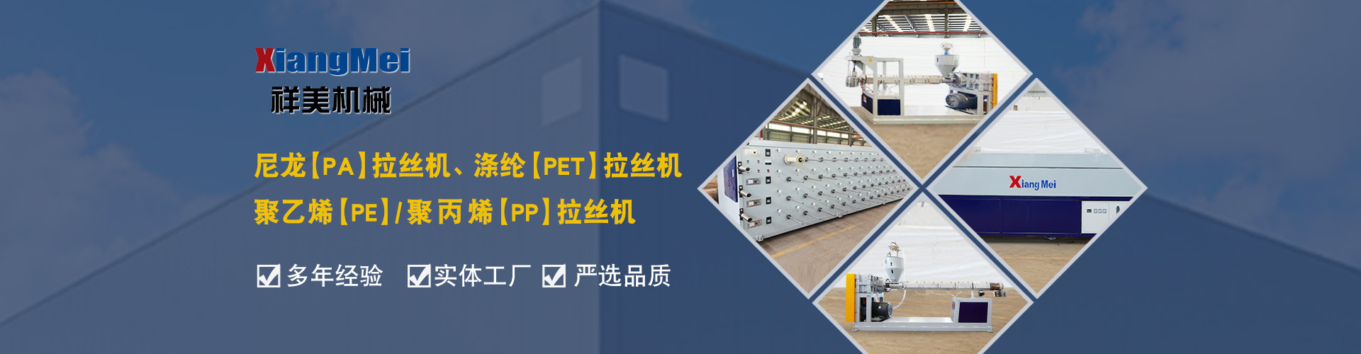 我公司是一家具有30多年專業生產塑料拉絲機的企業,作為國內最早生產圓絲塑料拉絲設備的企業,成為國內同行競相爭仿的標桿,公司產品主要可以生產聚乙烯(PE)、尼龍(PA)、聚丙烯(PP)、滌綸(PET)等作原料拉絲機設備及其配套設備、鉛芯機設備及其配套設備,拉絲機設備主要生產的產品有單絲、復絲、扁絲、刷絲、草坪絲、拉鏈絲、割草線等各類線絲,公司產品在國內同行業中性價比高、有良好的口碑,曾獲“國家高新技術、新產品博覽會金獎”被輕工部定位替代進口產品、國家級新產品,并多次獲得省、市科技進步獎,產品遍布全國大部分地區,并遠銷日本、意大利、俄羅斯、韓國、印度、澳大利亞、印度尼西亞、墨西哥、菲律賓、泰國、朝鮮、巴基斯坦、烏茲別克斯坦、越南、馬來西亞、老撾、越南、坦桑尼亞等國家和地區。 公司實行現代化企業管理,始終秉承以科技為先導,制造為基礎,管理為核心的企業面貌,運用先進的生產設備,創(chuàng)新的思維理念,確保產品多樣化、系列化,高品質,把誠信、責任、創(chuàng)新作為祥美人不斷的追求的目標,為新老客戶打造高品質的拉絲設備。 公司位于黃海之濱、亞歐大陸橋東橋頭堡的海濱城市——連云港,這有海陸空便捷的交通網絡、風景秀麗的山海風光,總經理江中堯先生攜公司全體員工竭誠歡迎各界人士、中外新老客戶來連洽談業務。